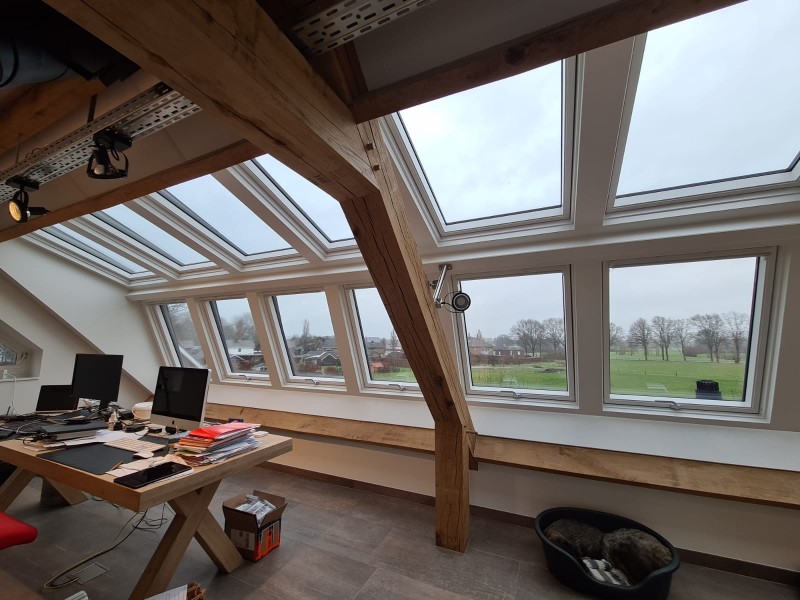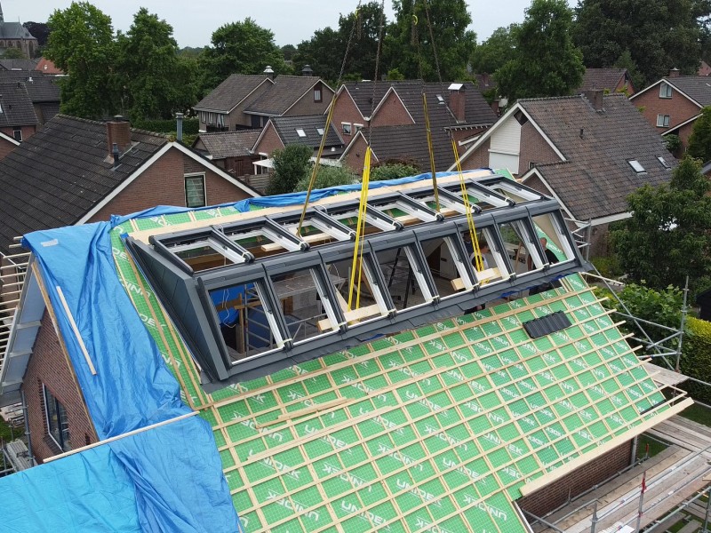 Deze week gemonteerd in Zieuwent: Dakkapel Modulair Serre XXXL, voorzien van 8 VELUX GPU uitzet-tuimel vensters onder en 8 GGU tuimel ramen boven, allemaal met triple beglazing en voorzien van solar rolluiken.