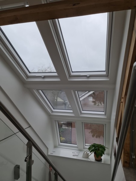 Wat een geweldige beleving geven deze daglicht oplossingen aan het huis, een prachtig uitzicht over het weiland en een zee aan ruimte bij de trapopgang. Heel veel ruimte, daglicht en ventilatie geplaatst door Dakramennederland in samen werking met Dakkapellen Modulair.