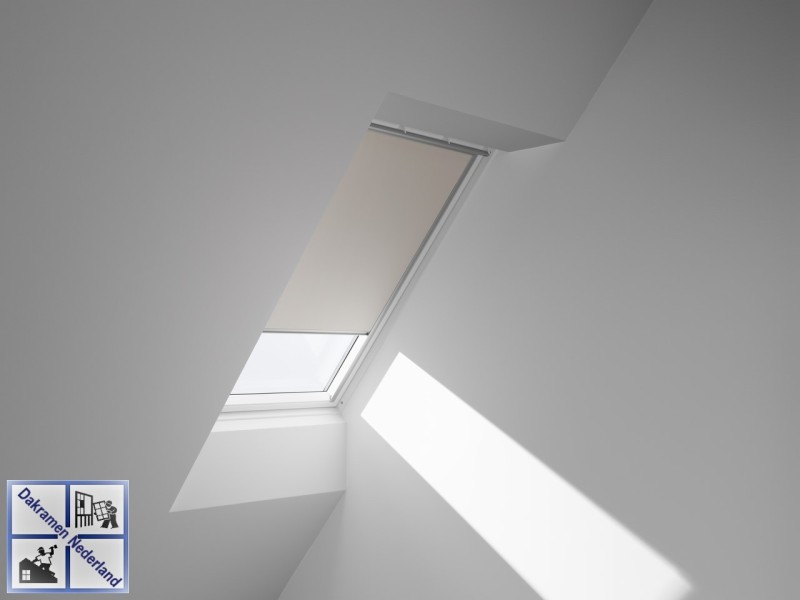 Opruiming 2x VELUX verduisterend rolgordijn handbediend (DKL) maat F04, kleur 1085 Beige met aluminium cassette en zijgeleiders, dichte verpakking